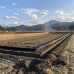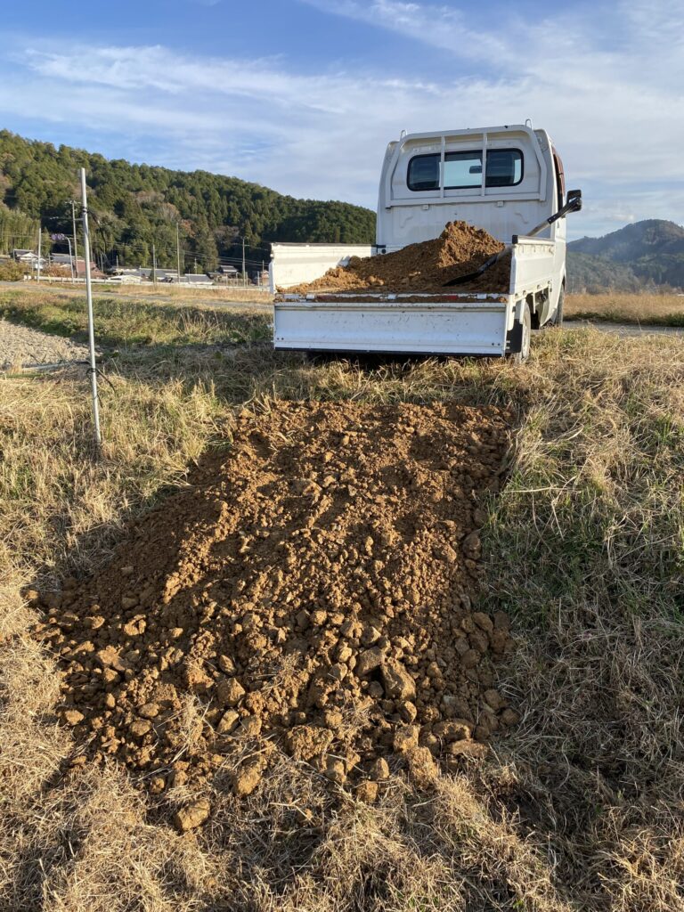 - 出入口の整備と圃場(ほじょう、畑)にトラクターなどの農業機械や資材を運び入れるための出入り口も必要です。今回は、**山土(やまつち)**を購入し、これを敷いて出入り口を舗装する作業を行いました。