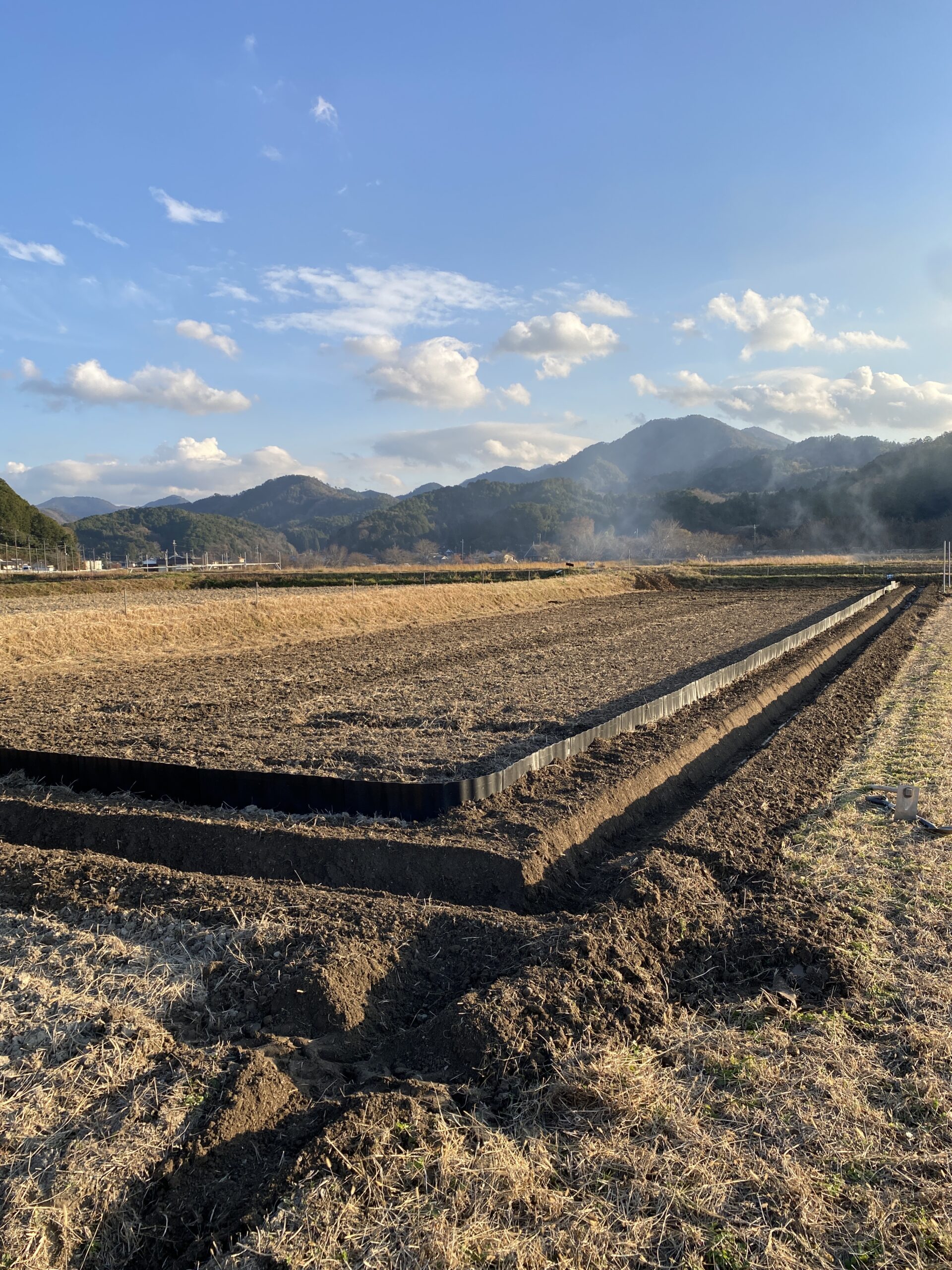 - 畦板(あぜいた)の設置。まず、水稲エリア5aを、他の畑としっかり区切るために畦板を設置しました。これで水が漏れるのを防ぎ、稲を育てる環境が整います。