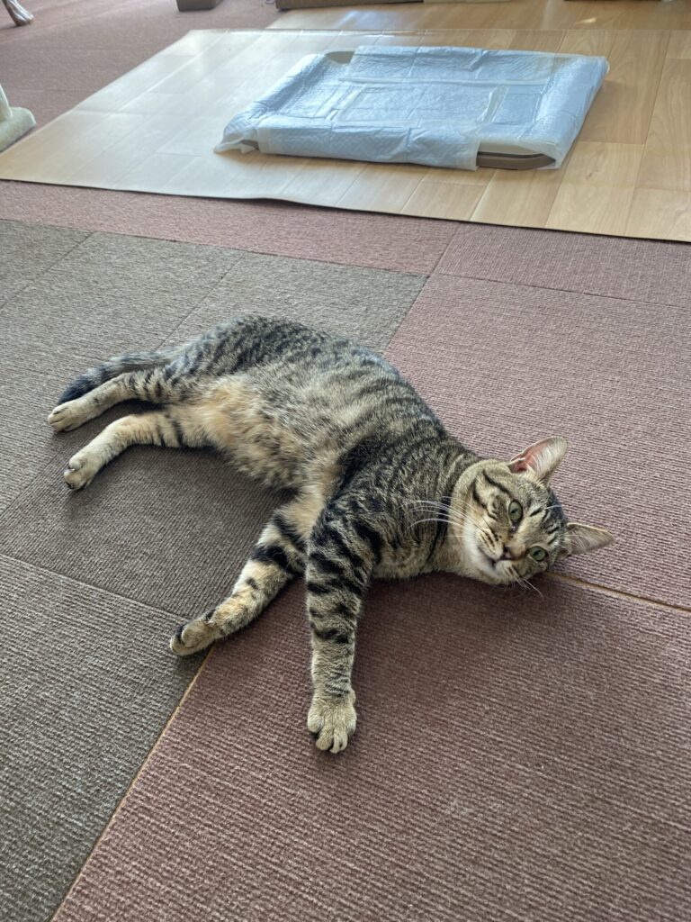 目が覚めて私の姿を見つけると、「さあ、私を撫でるがいい」と言わんばかりにお腹やお尻を見せてくる。